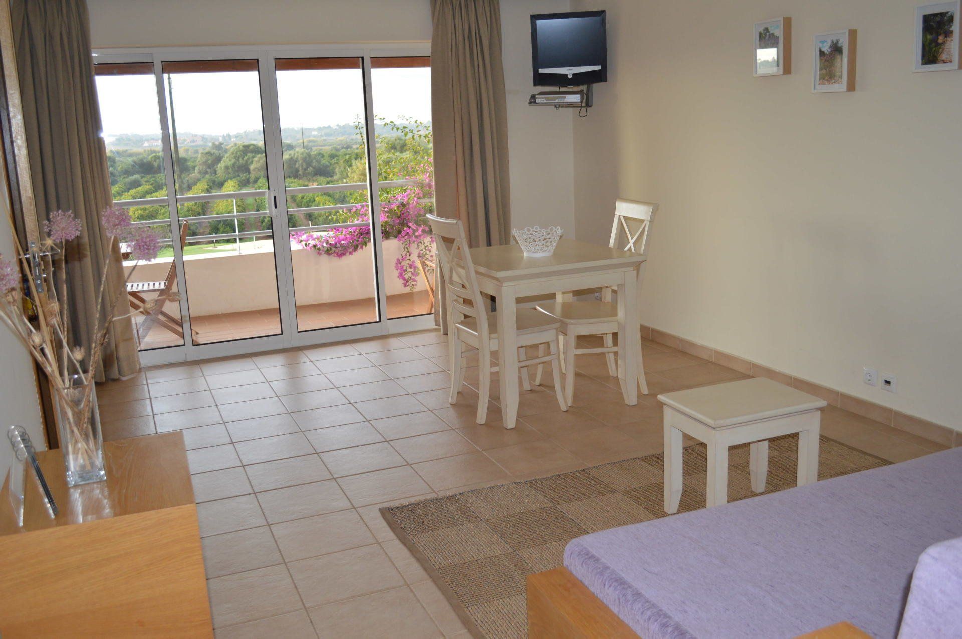 Estudios con camas dobles o dos camas individuales, baño, cocina americana equipada y comedor. Los estudios de la Quinta están ubicados en el primer piso y cuentan con un balcón que ofrece una amplia vista sobre el césped y la piscina.